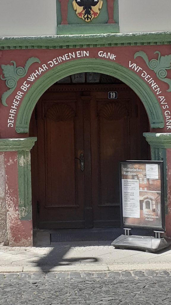 Darunter, das „Jede Gemeinde ihren Pfarrer selbst wählen dürfen soll“; das „Die Leibeigenschaft abgeschafft werden soll“, das „Jedermann freie Nutzung von Jagd und Fischfang haben soll“ und „In den Gemeindewäldern jeder Brennholz schlagen dürfen soll“ sowie andere. Inmitten der Altstadt von Mühlhausen kommen wir noch am historischen Rathaus mit dem reichsstädtischen Archiv von 1280 vorbei. Einprägsam und wahr der Spruch über der Tür.