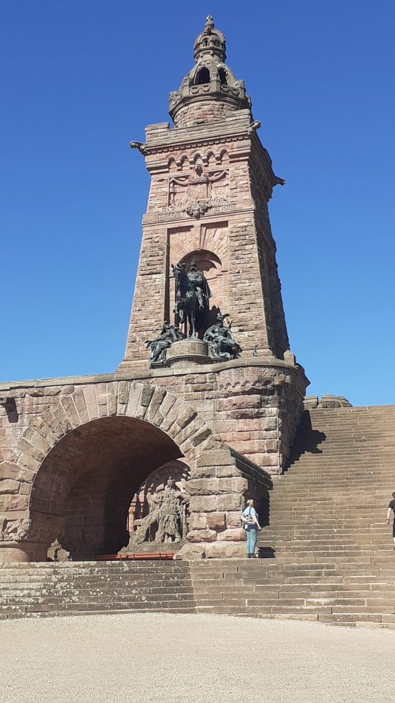 Ein Abstecher führt uns zum naheliegenden Kyffhäuserdenkmal, entworfen vom Berliner Architekten Bruno Schmitz. Im Mai 1892 fand die Grundsteinlegung statt und im Juni 1896 wurde das Denkmal eingeweiht. Hauptteil des Monumentes ist der Turm mit der Darstellung Kaiser Friedrich I. Barbarossa und Wilhelm I. Nach 306 Stufen erreichen wir den Aussichtspunkt und haben einen imposanten Blick auf die Kyffhäuser-Landschaft mit goldgelben Kornfeldern.