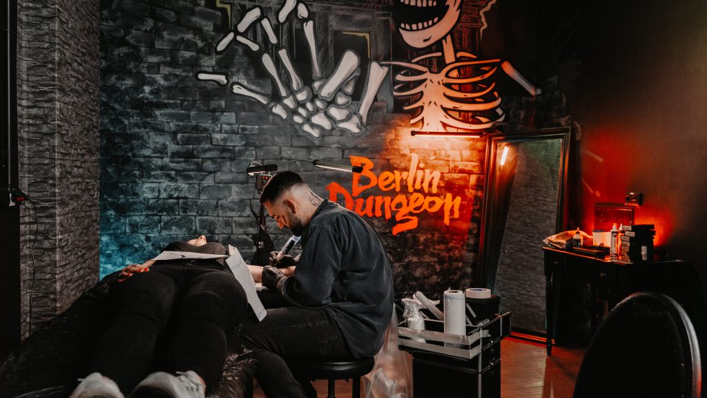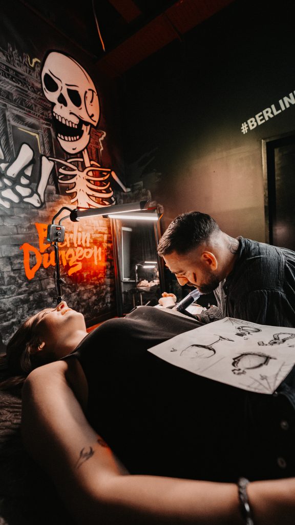 Im Berlin Dungeon herrscht nämlich schon jetzt Halloween-Stimmung. „Als Tätowierer habe ich schon an vielen Orten tätowiert, viele davon waren auch etwas spezieller. Als die Anfrage vom Berlin Dungeon kam, habe ich mich total gefreut, weil das für mich als Artist etwas komplett neues war“, sagt Denis Blume, einer der derzeit angesagtesten Tattoo- Artists der Hauptstadt. „Die Kulissen, die Soundeffekte und die ganze Atmosphäre machen