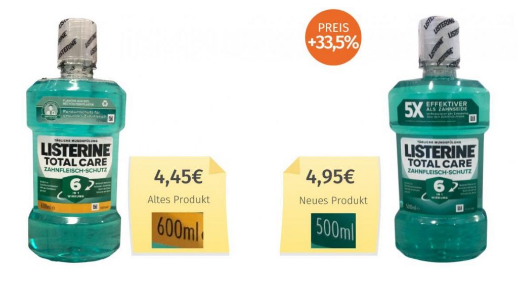 Inhalt und wird gleichzeitig teurer – plus 22 Prozent. Und die aktuelle „Mogelpackung des Monats“ September der Verbraucherzentrale Hamburg, die Mundspülung Listerine von Johnson & Johnson, ist ebenfalls eine doppelte Preiserhöhung und um mehr als 33 Prozent teurer geworden.