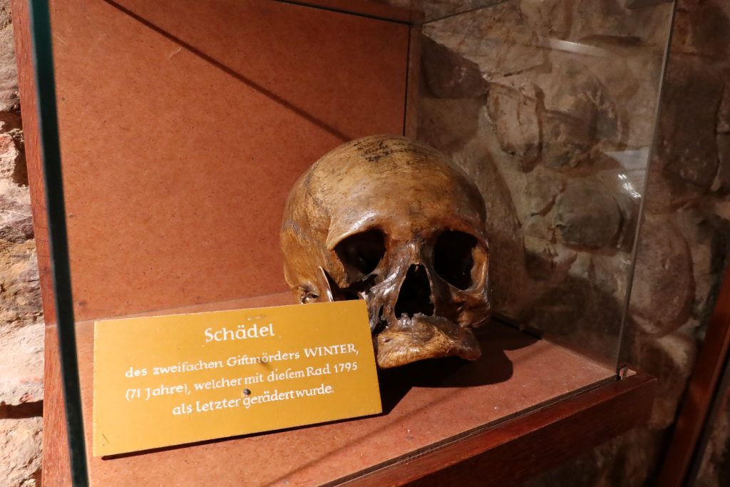Im Keller des Henkerhauses befindet sich der originale Schädel des Giftmörders Winter. Im 18. Jahrhundert hat er zwei Menschen vergiftet. Das Urteil wurde ihm im Gefängnis verkündet. Dort erkrankte er mutmaßlich durch in Gift getränkte Speisen, die ihm seine Tochter brachte. Daraufhin verstarb er in der Nacht vom 14. zum 15. Februar 1795. Trotzdem sollte er seine gerechte Strafe bekommen. Fünf Tage später wurde seine Leiche öffentlich gerädert. Auch das entsprechende Richtrad wird im Henkerhaus ausgestellt.