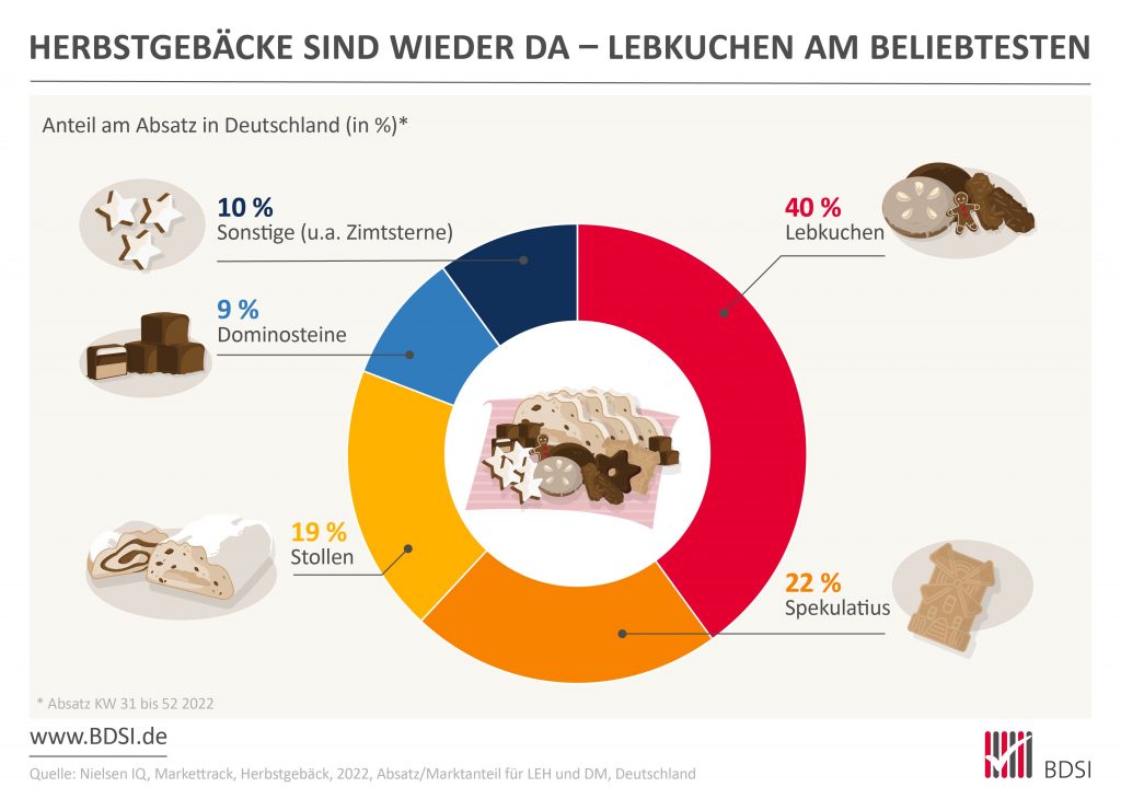Innerhalb des Herbstgebäckes waren nach den Absatzzahlen des Marktforschungs-Unternehmens Nielsen (Nielsen IQ, Markttrack, Herbstgebäck, 2022, Absatz/Marktanteil für Lebensmitteleinzelhandel und Drogeriemärkte, Deutschland – Zeitraum KW 31 bis 52) auch im Jahr 2022 die Lebkuchen erneut mit 40 % die klaren Favoriten beim deutschen Verbraucher. Zurückzuführen ist dies u. a. auf die große Vielfalt, zu der die unterschiedlichen Oblaten-Lebkuchen ebenso gehören wie verschiedene Braune Lebkuchen wie etwa Lebkuchenherzen, Printen, Spitzkuchen, Honigkuchen oder Pfeffernüsse. Spekulatius nehmen mit 22 % den zweiten Platz ein, gefolgt von Stollen – wie im Vorjahr – mit 19 %. Der Absatzanteil von „Sonstigen“ mit Zimtsternen, herbstlichem Mürbegebäck und anderen saisonalen Erzeugnissen liegt bei 10 %; während Dominosteine, eine besondere Art der Braunen Lebkuchen, wie 2021 bei 9 % liegen.